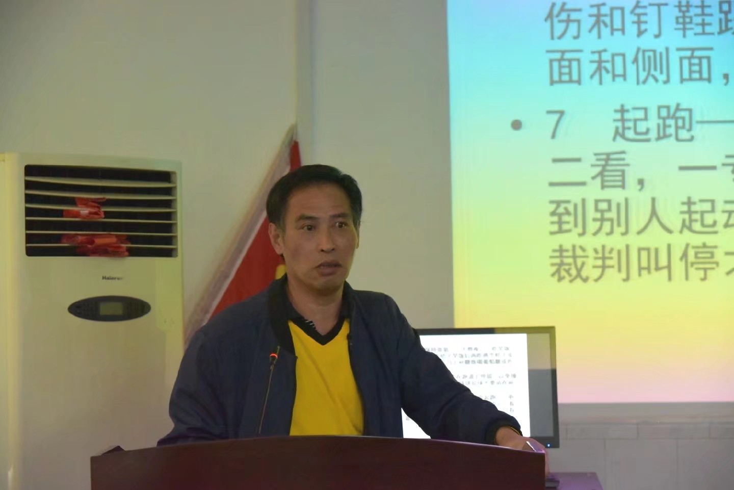 首先,黄笃之老师做了开场讲话。他强调:运动会是近日学校最大的活动,希望在座各位运动员要格外注意。随后,黄笃之老师就运动会的注意事项进行了详细的介绍。黄笃之指出以往的运动会失利的很大一部分原因在于运动员日常的训练不足。他要求运动员们要加强赛前的训练,针对自己的项目按不同的标准训练,尤其要增强自己的肌肉力量。就运动会中的比赛,黄笃之老师向运动员们提出一些小技巧和赛前的饮食搭配。最后,学生会主席张煜翀发表了总结讲话,他希望运动员们可以再接再厉,在运动会中取得优异的成绩。