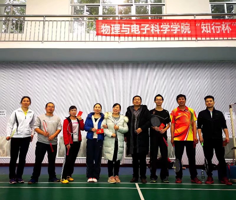 本次比赛分为男女子单打、男女子双打以及男女混合双打五个部分,随时裁判一声令下比赛正式开始了。整个下午的比赛充满着激情,在男子单打的比赛中,18级选手胡旭,他那瘦瘦的身躯迸发出巨大的能量,不断的在赛场上奔跑,时而用力挥舞着球拍起跳杀球,时而又用柔劲让对手防不胜防最终拿下男子单打的冠军。接下来荣识老师、詹杰老师和阳明旭、刘雨阳同学的男子双打将比赛带到了高潮。从一开始双方就使出全力,比分一直追的很紧,差距不超过两分,双方队员都配合默契,赛场外的观众都在聚精会神的观看比赛,每一次赢球都会激起台下观众的掌声。男子双打比赛中,老师队首先赢下一局,随后学生队不甘示弱也拿下一局,最后老师队凭借自己的实力和经验拿下最后一局。最后,老师队以4:1的总比分战胜学生队获得胜利,工作人员随后合影留念,比赛自此完美落幕。