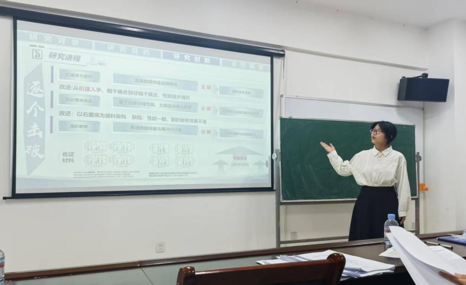 答辩现场,各团队以精心设计的PPT、动态演示视频为载体,结合流畅专业的讲解,系统呈现项目全貌。从研究背景的深度挖掘到市场应用价值的精准剖析,从创新突破点的大胆构想至技术路线的严谨规划,生动展现物电学子扎实的专业素养与敏锐的科创思维。
