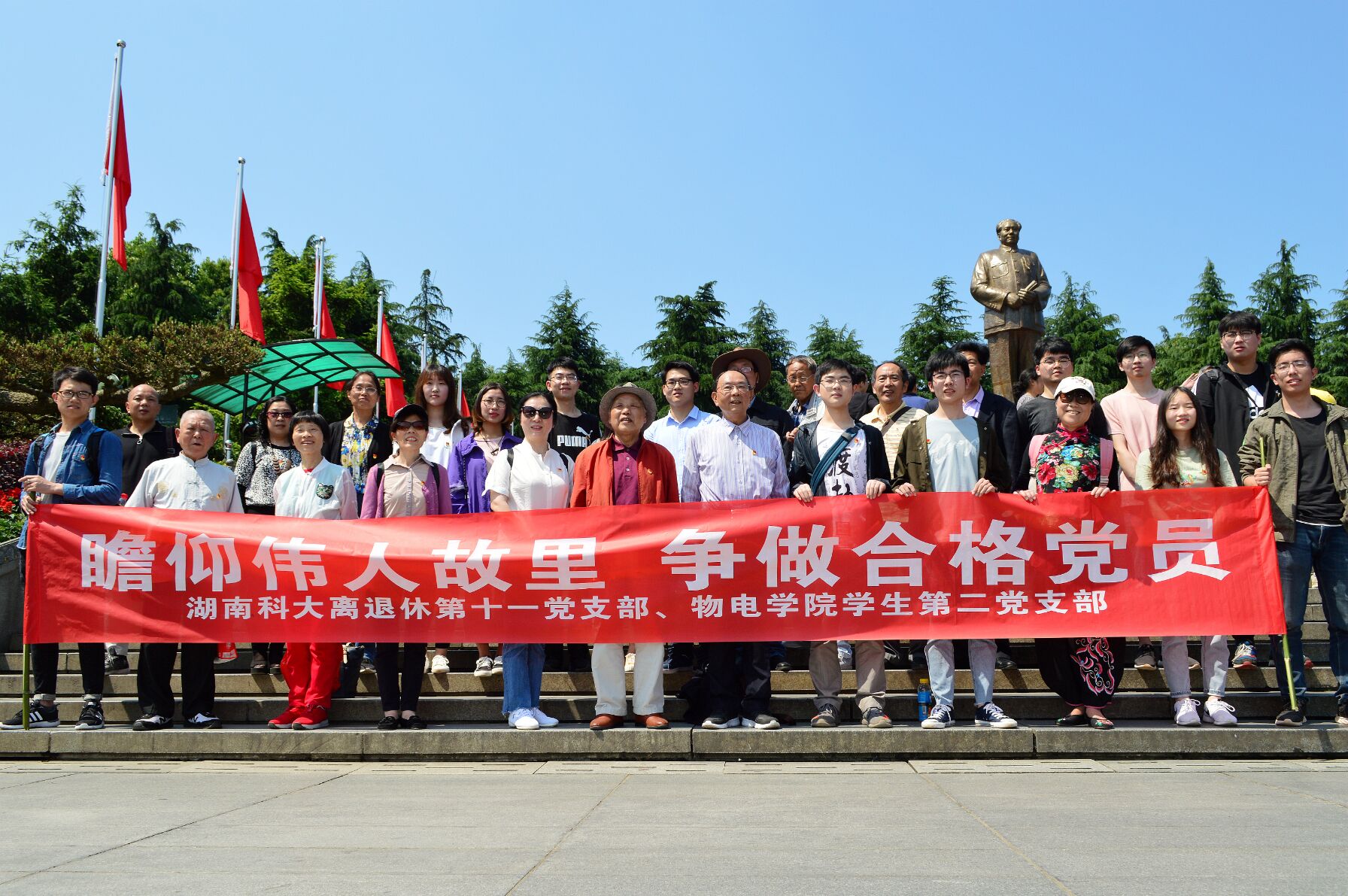 五月的湘潭,繁花似锦,春意盎然。上午8:30,在离退休第十一党支部书记卢长吾与tapplay学生第二党支部书记范文祥的带领下,两个党支部共28名党员乘车前往革命胜地韶山,瞻仰伟人风貌,学习红色精神。